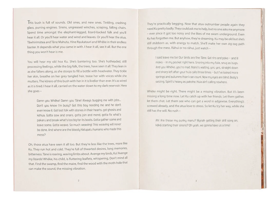 Te Whakaora is a short fiction about a kuia roaming a post apocalypse world trying to invent new rongoā from the mess and heal things. There's natives and weeds and decomposing building matter and birds and sheep and pollutants and germs and atua and taonga pūoro and the sounds of before and after... and an insouciant taniwha.